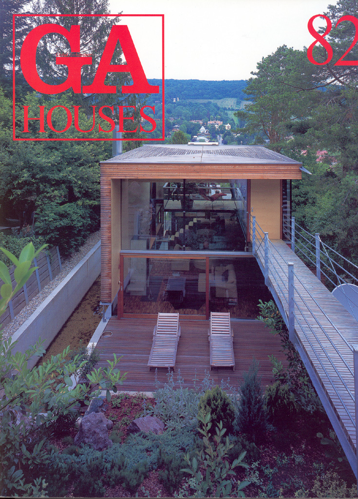 The gallery of the two storey high living room is open up to the roof terrace. Under the terrace there is the dining kitchen with balcony, underneath the sleeping room and an open bathroom are situated. In the basic level the office, the entrance space and supporting rooms are housed.